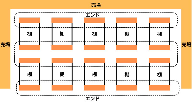通路に面した棚の端(エンド)や、入り口付近の催事スペースです。 ※上記画像の点線部分