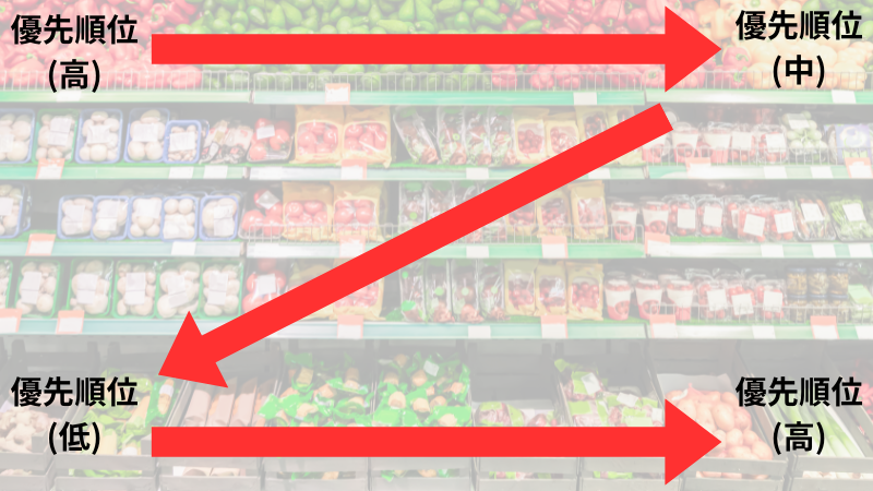 お客様が棚を見る際、視線は「左上から右下」へ、あるいは「左から右」へと流れる傾向があります(Zの法則)。 この習性を利用し、以下のような配置にするのが基本です。
